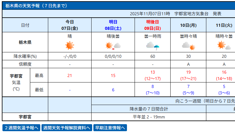 気象庁の天気予報によると、日曜日は曇り一時雨のようです。